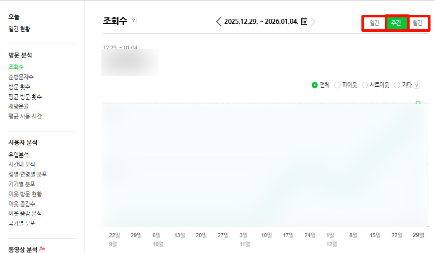 조회수 화면 오른쪽 상단을 보면 일간, 주간, 월간 버튼이 표시되어 있습니다. 이 버튼을 통해 보고 싶은 기간에 맞게 조회수 기준을 자유롭게 변경할 수 있습니다. 단기 흐름을 보고 싶다면 일간, 전체적인 성장 추이를 보고 싶다면 월간이 유용합니다.